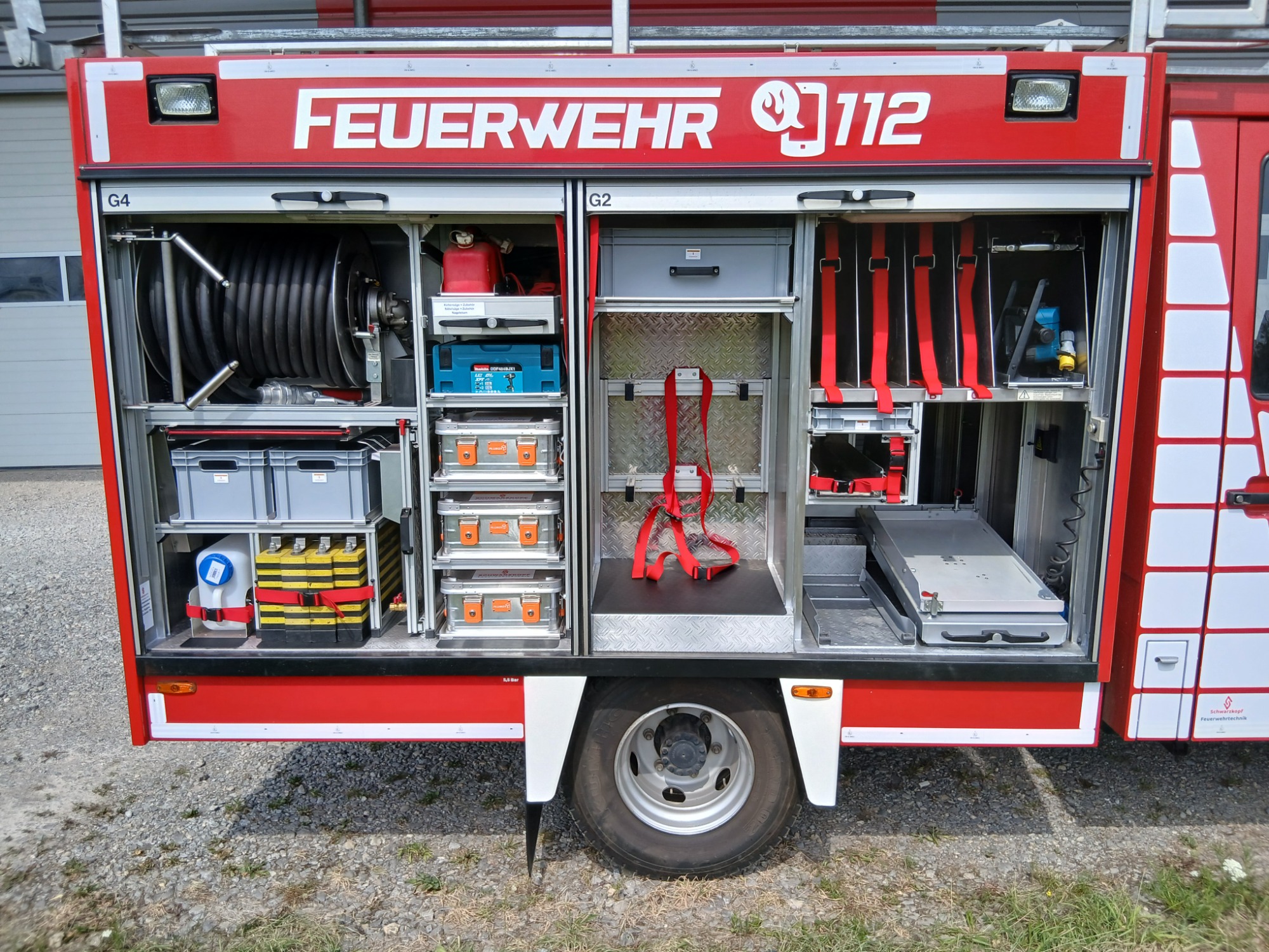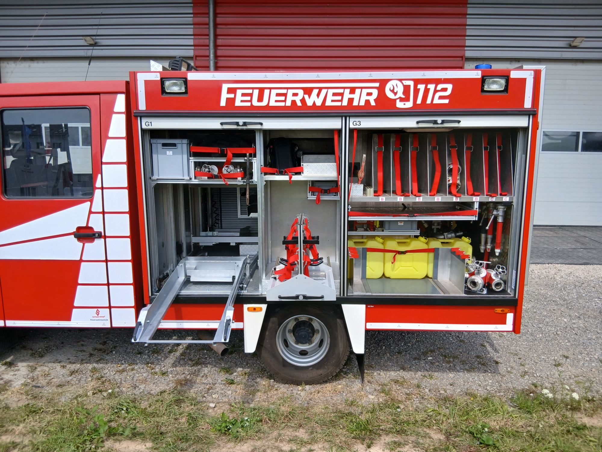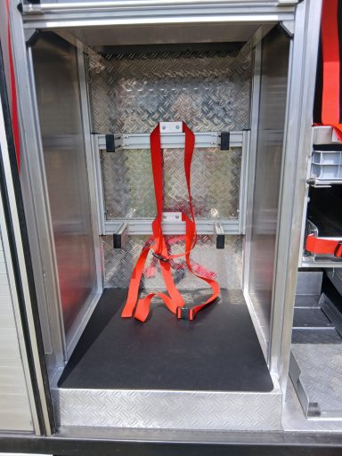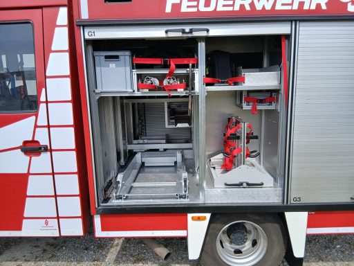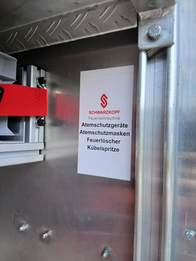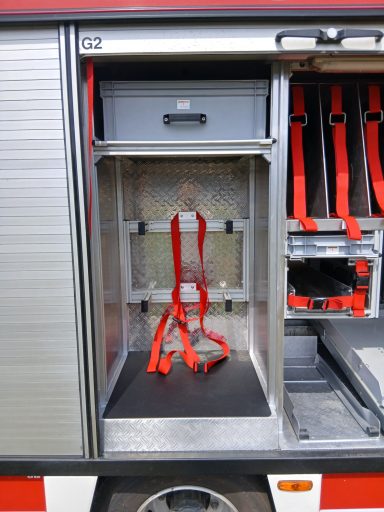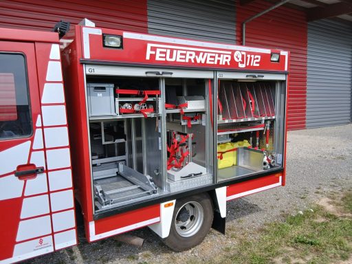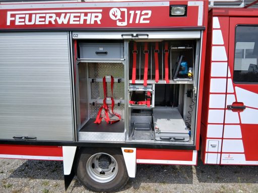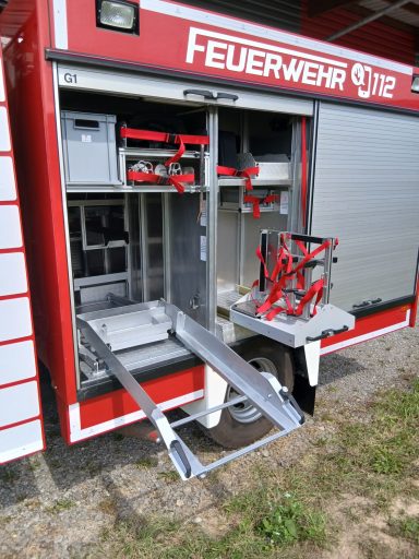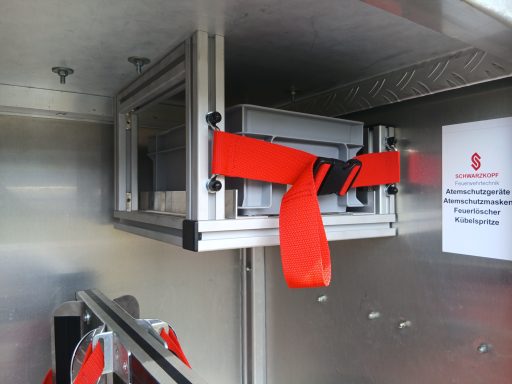 7x Warnweste, 2x Atemschutzgerät, 2x Atemschutzmaske, 4x Feuerwehrleine, 1x Tasche Tragetuch, 1x Tasche Fluchthaube (2 Stück), 1x Erste-Hilfe-Rucksack, 1x Atemschutzüberwachung, 1x Pack Infektionsschutzhandschuhe, 2x Warnflagge, 6x Feuerwehr-Haltegurt, Platz für Zusatzbeladung