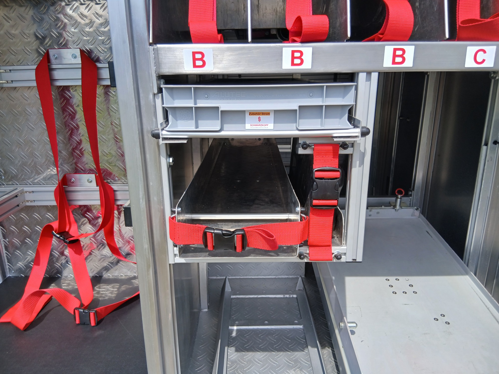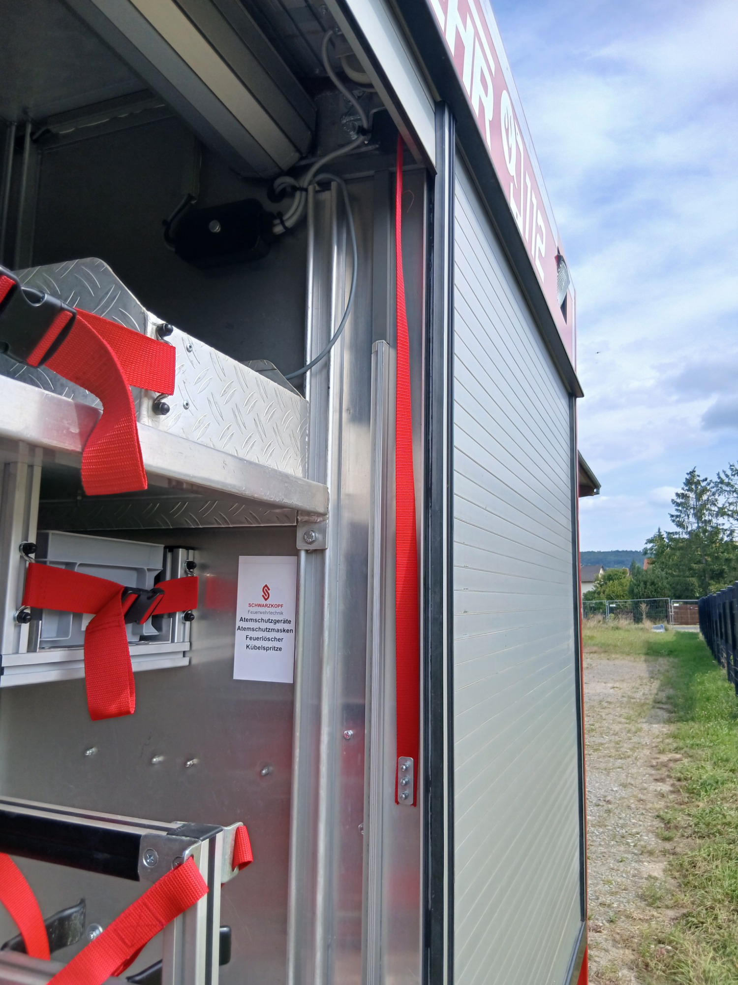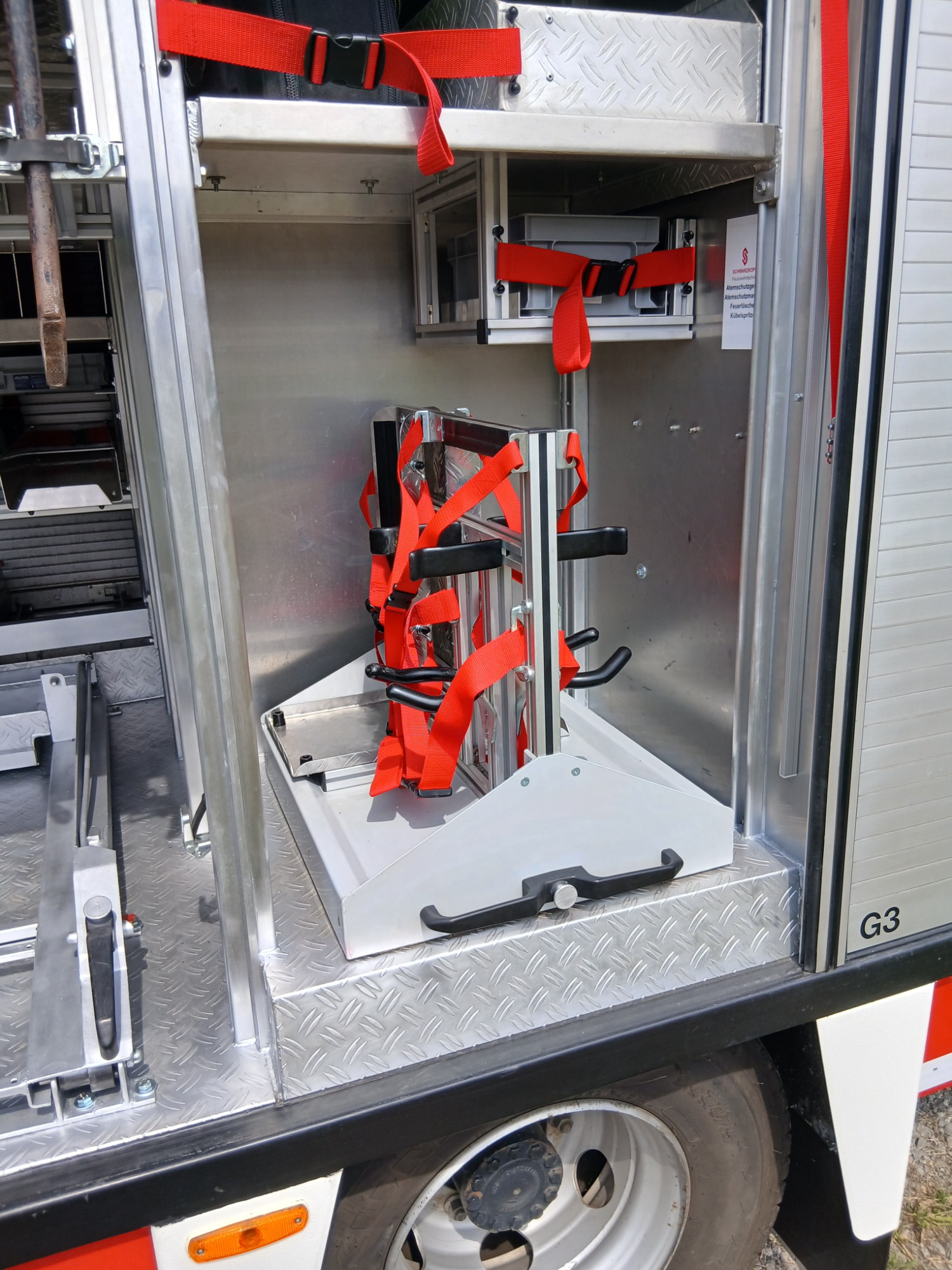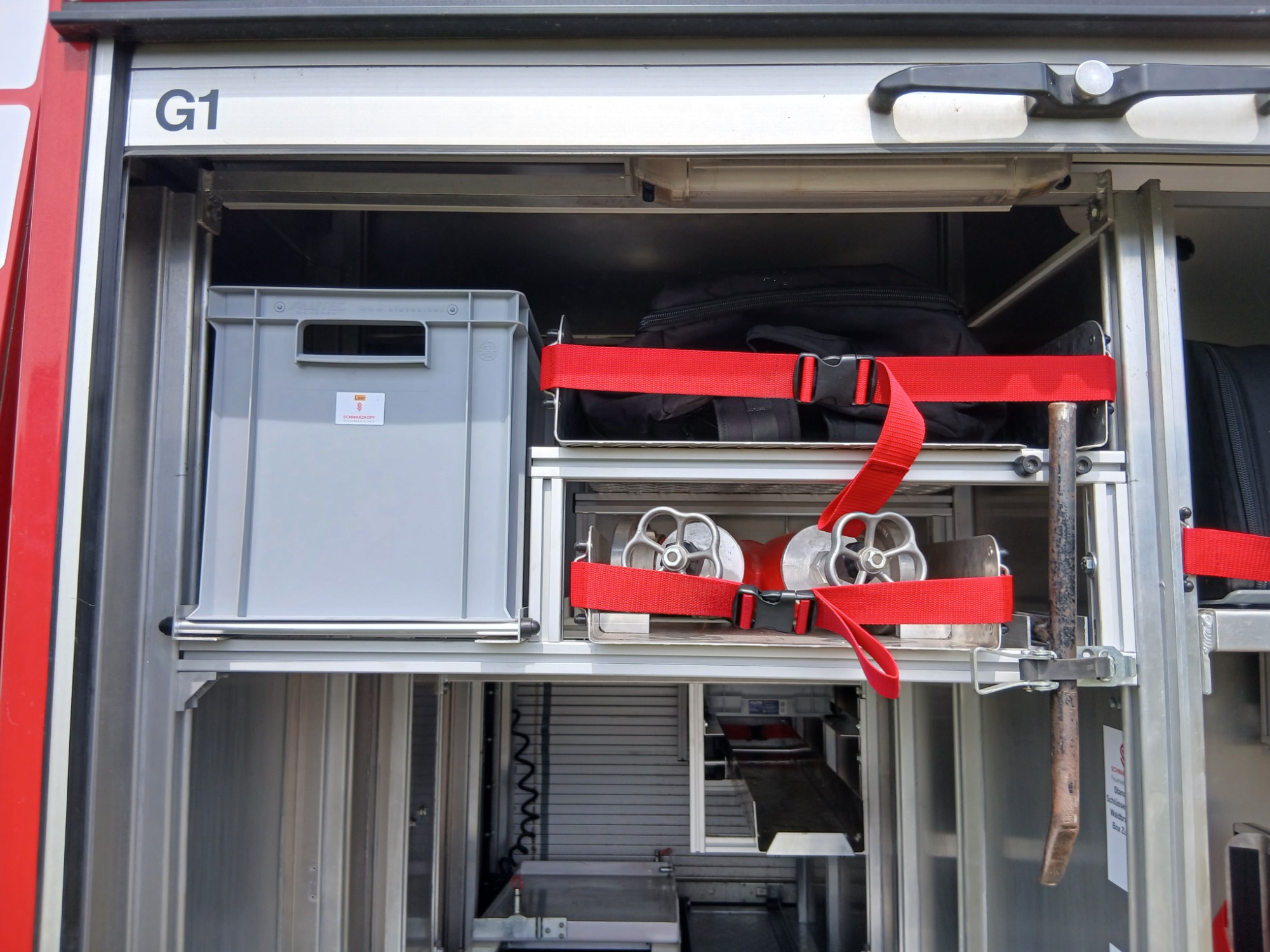 7x Warnweste, 2x Atemschutzgerät, 2x Atemschutzmaske, 4x Feuerwehrleine, 1x Tasche Tragetuch, 1x Tasche Fluchthaube (2 Stück), 1x Erste-Hilfe-Rucksack, 1x Atemschutzüberwachung, 1x Pack Infektionsschutzhandschuhe, 2x Warnflagge, 6x Feuerwehr-Haltegurt, Platz für Zusatzbeladung