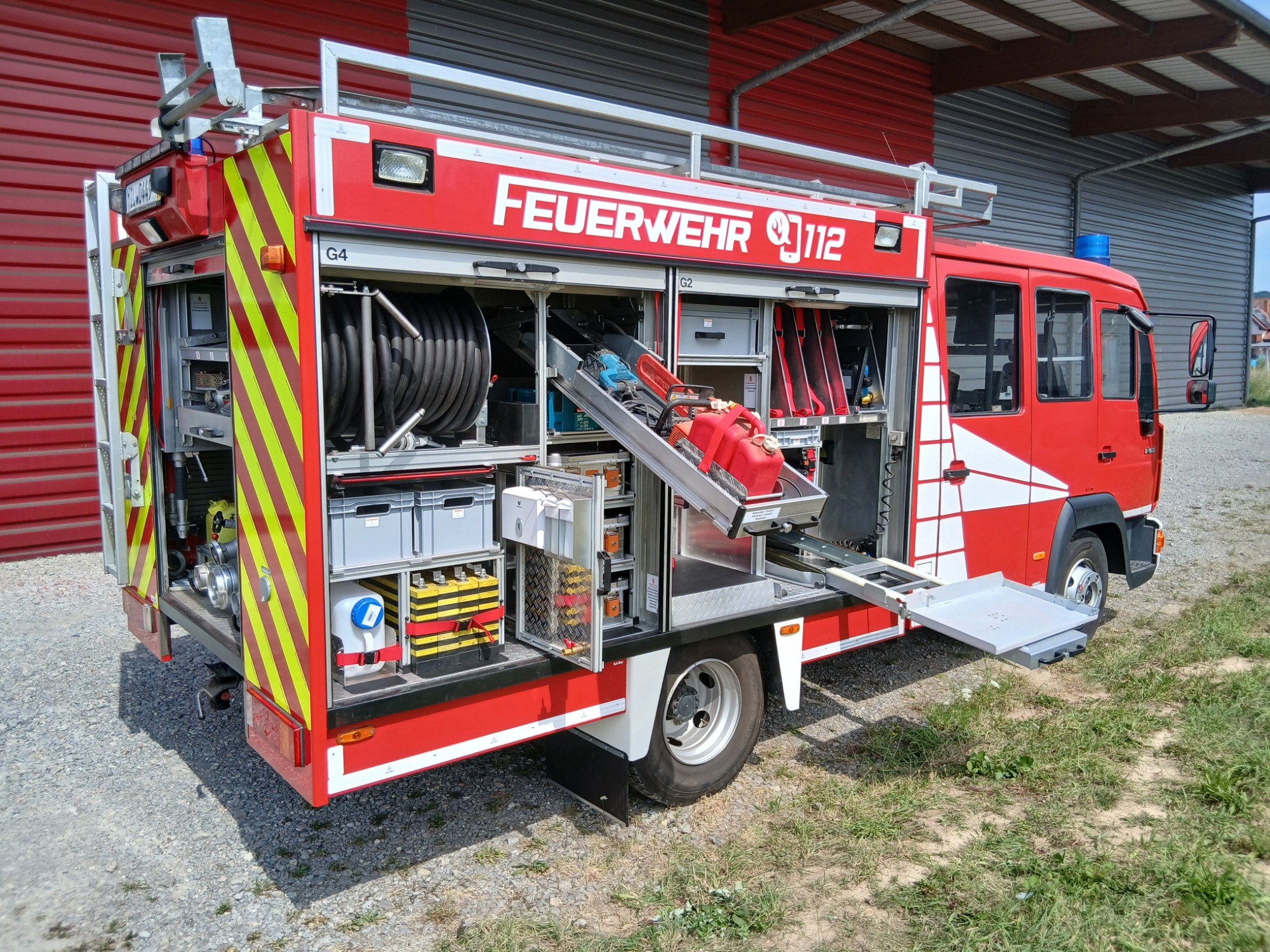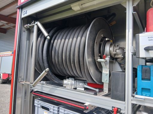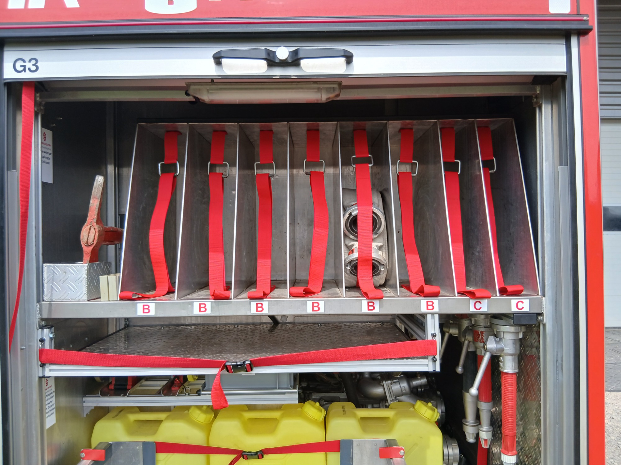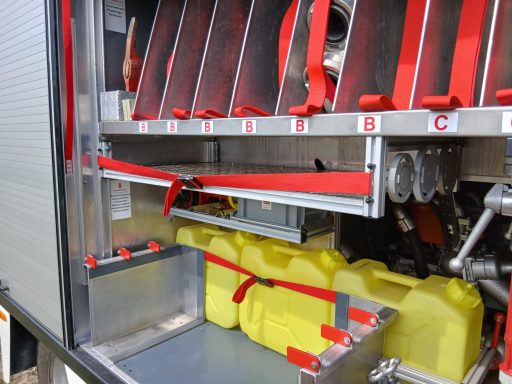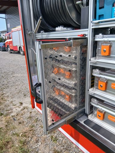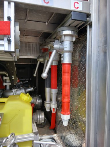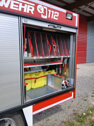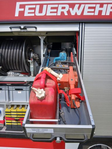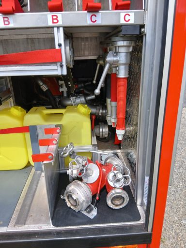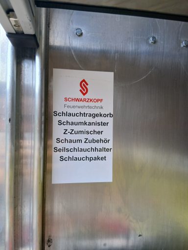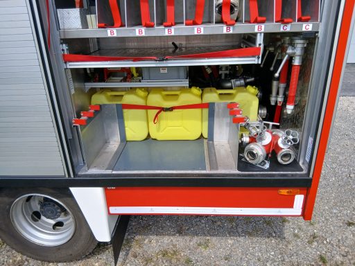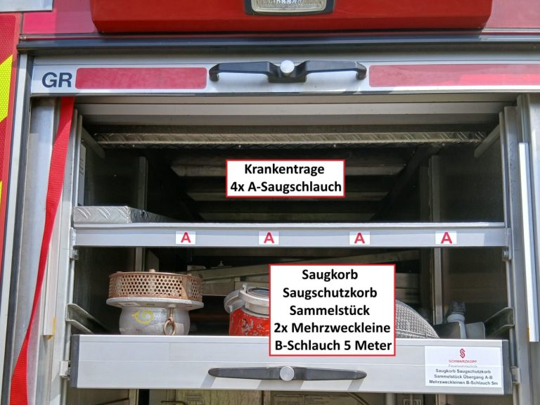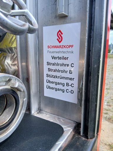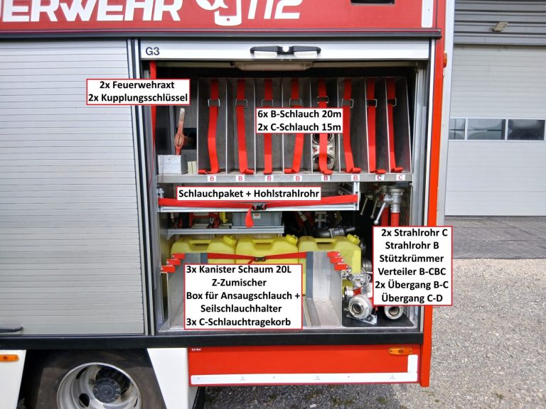 2x Feuerwehraxt, 2x Kupplungsschlüssel ABC, 6x B-Schlauch 20m, 2x C-Schlauch 15m, 1x C-Schlauchpaket 30m + C-Hohlstrahlrohr, 2x C-Strahlrohr, 1x B-Strahlrohr, 1x Stützkrümmer, 1x Verteiler B-CBC, 2x Übergangsstück B-C, 1x Übergangsstück C-D, 3x C-Schlauchtragekorb, 3x Kanister Schaummittel 20L, 1x Z-Zumischer, 1x Box (D-Ansaugschlauch, Seilschlauchhalter)