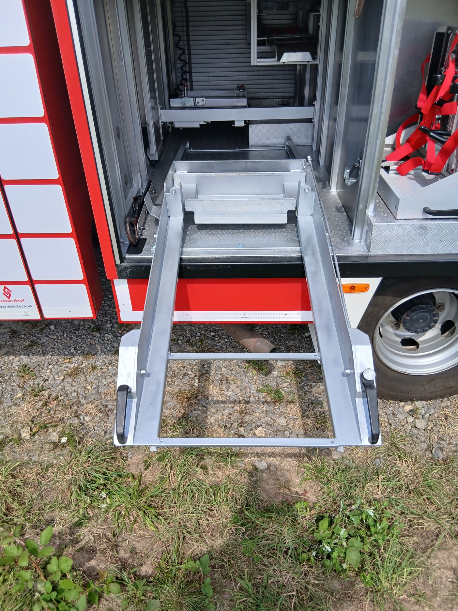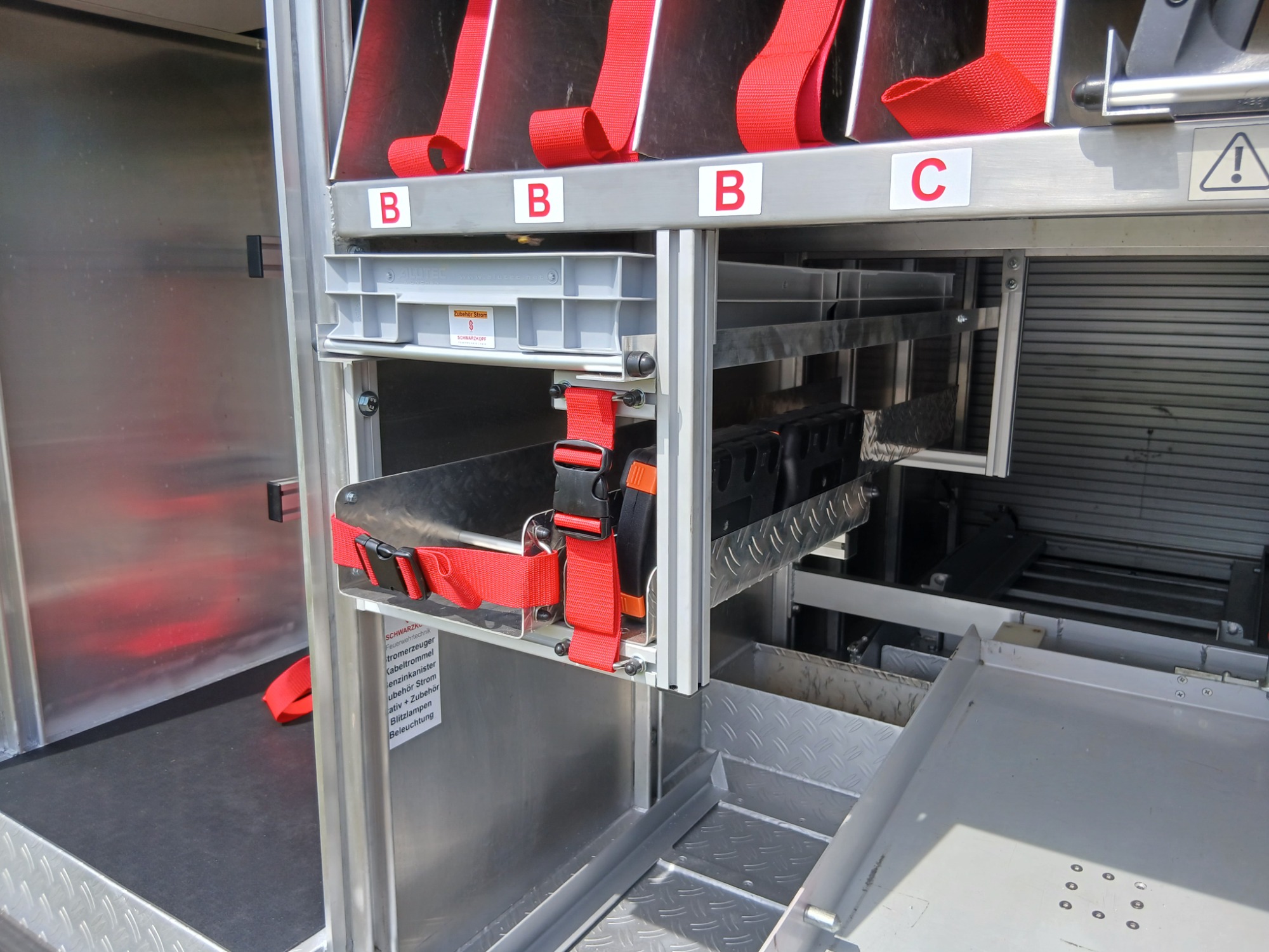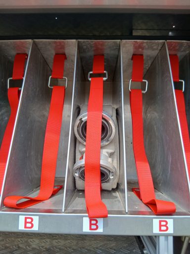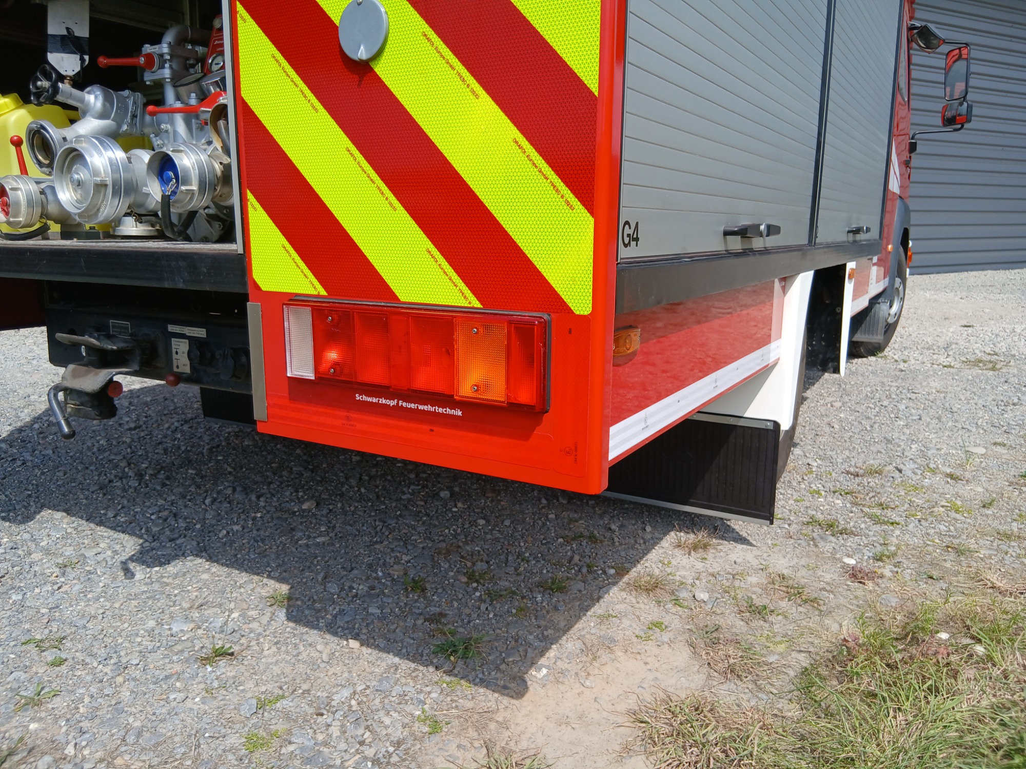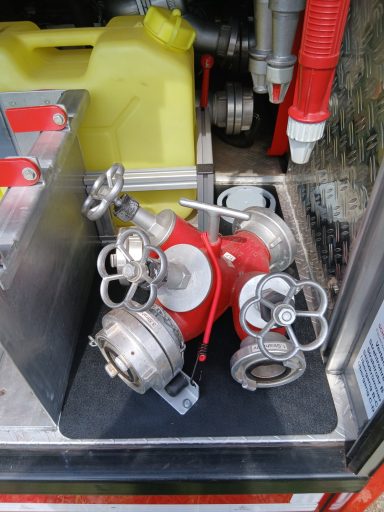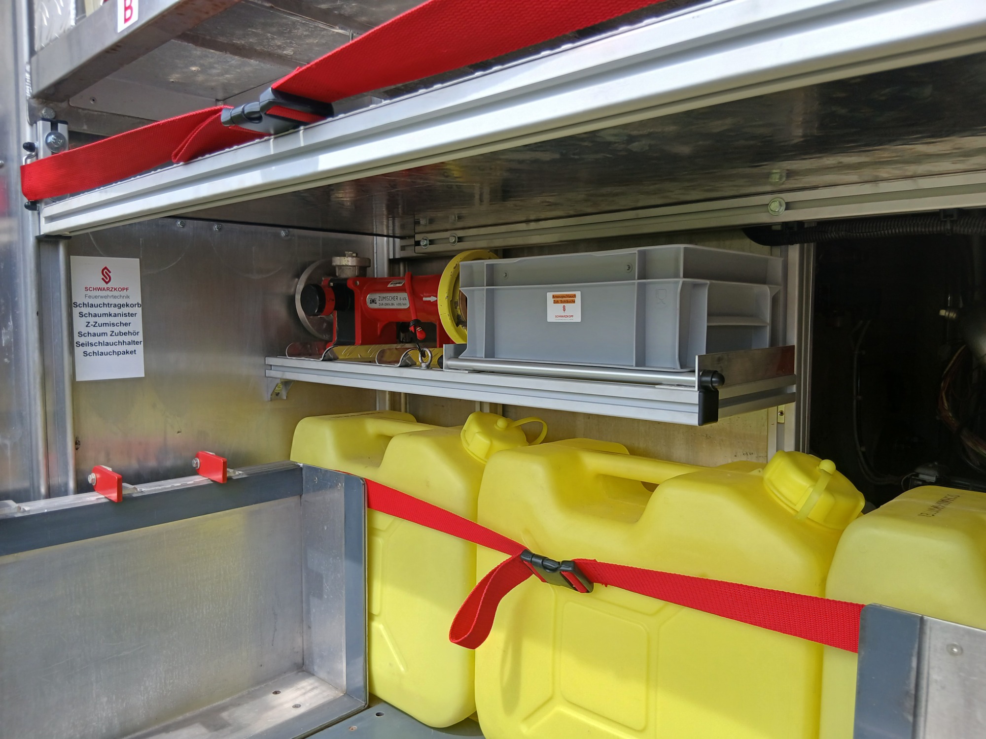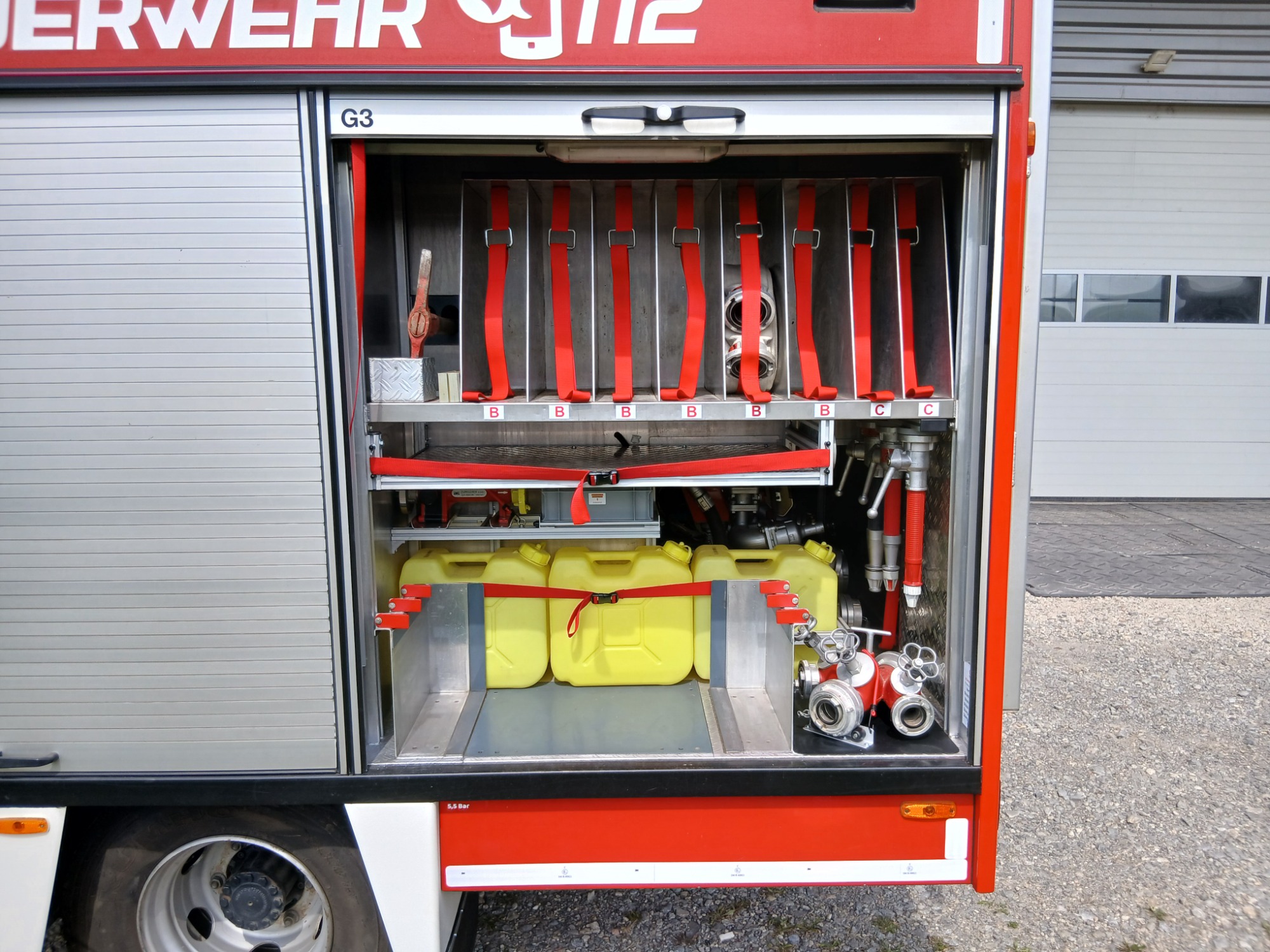 2x Feuerwehraxt, 2x Kupplungsschlüssel ABC, 6x B-Schlauch 20m, 2x C-Schlauch 15m, 1x C-Schlauchpaket 30m + C-Hohlstrahlrohr, 2x C-Strahlrohr, 1x B-Strahlrohr, 1x Stützkrümmer, 1x Verteiler B-CBC, 2x Übergangsstück B-C, 1x Übergangsstück C-D, 3x C-Schlauchtragekorb, 3x Kanister Schaummittel 20L, 1x Z-Zumischer, 1x Box (D-Ansaugschlauch, Seilschlauchhalter)