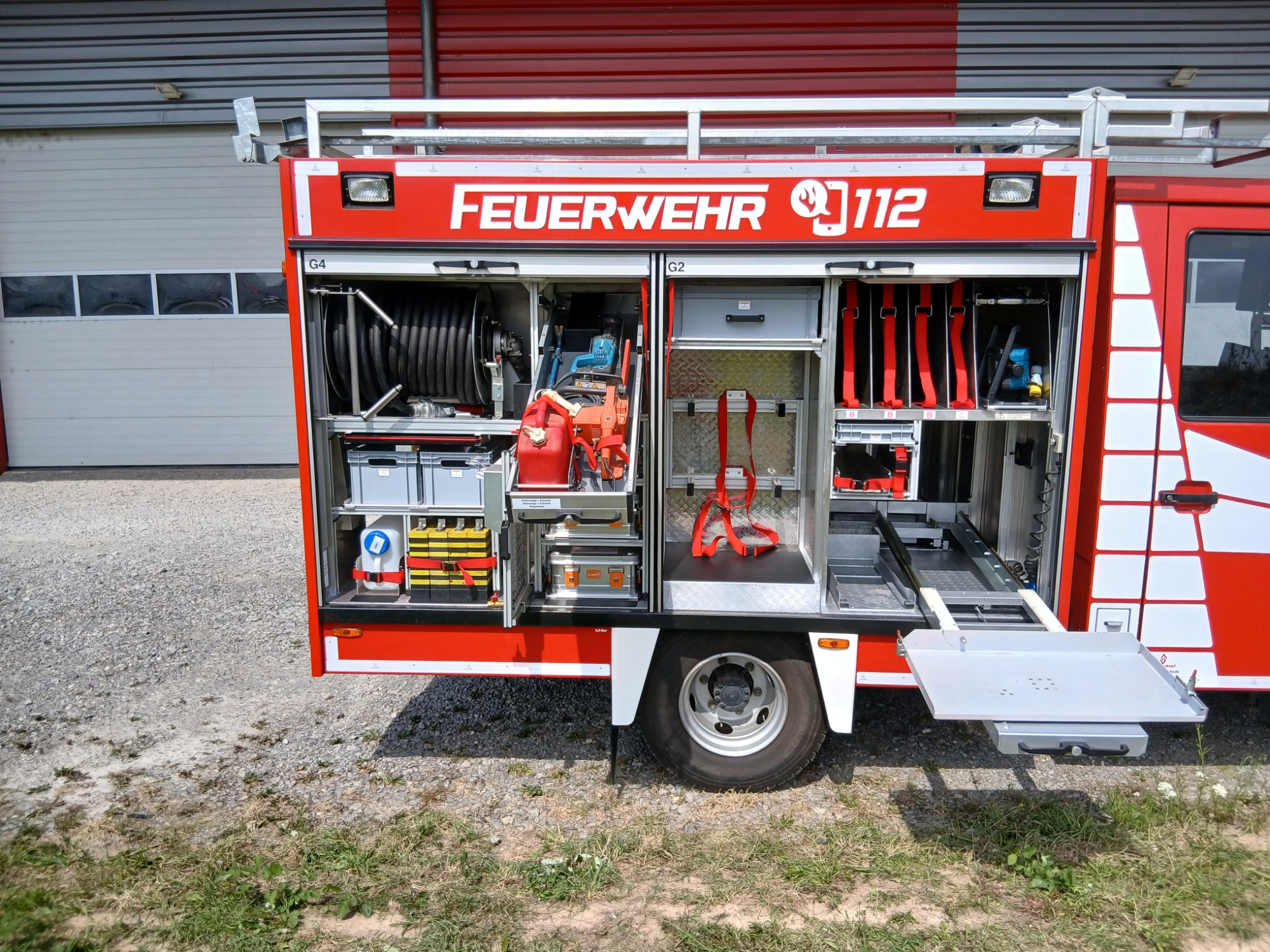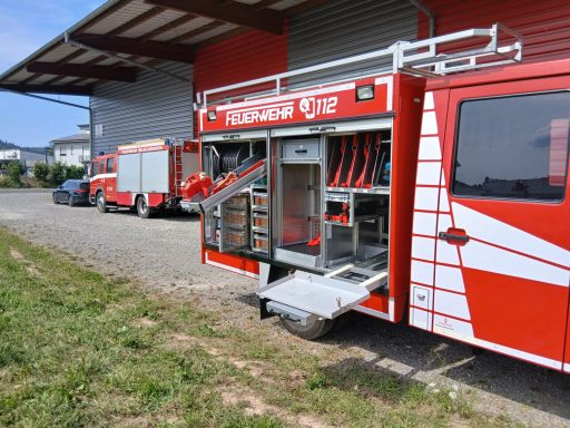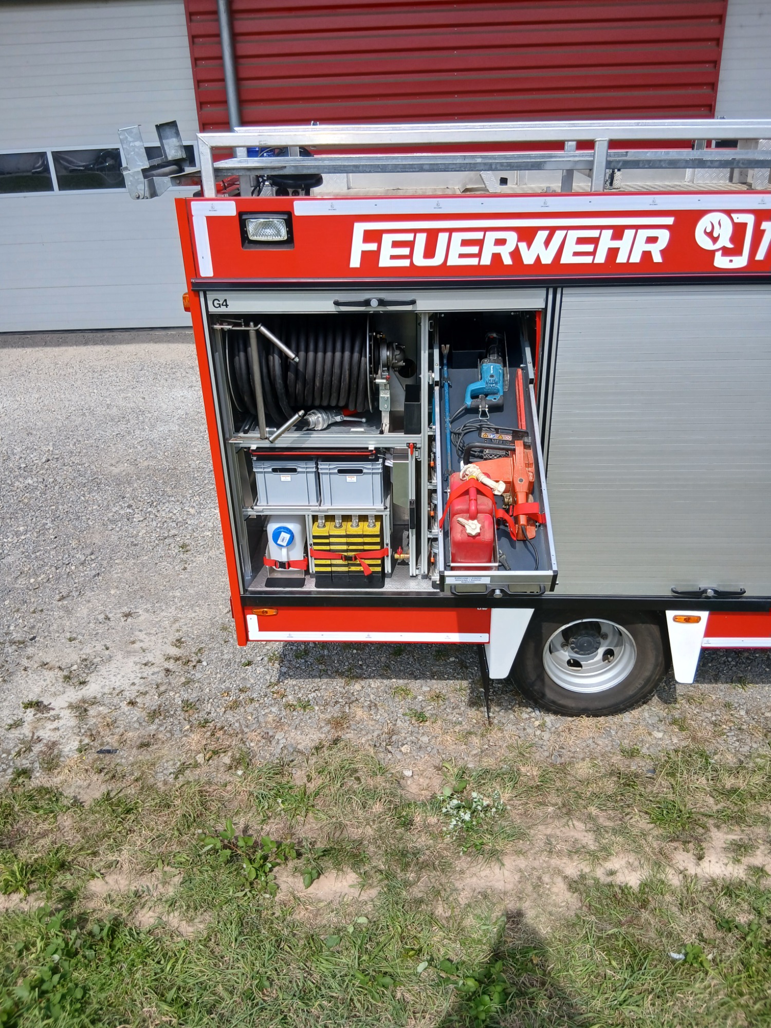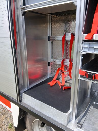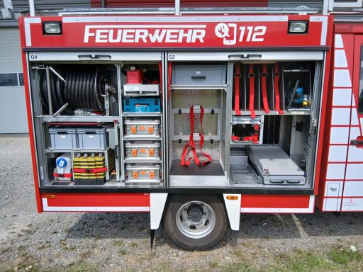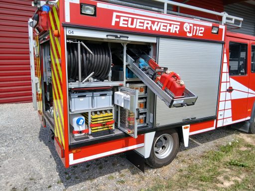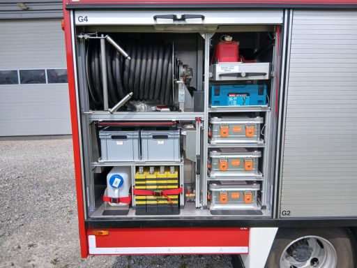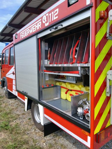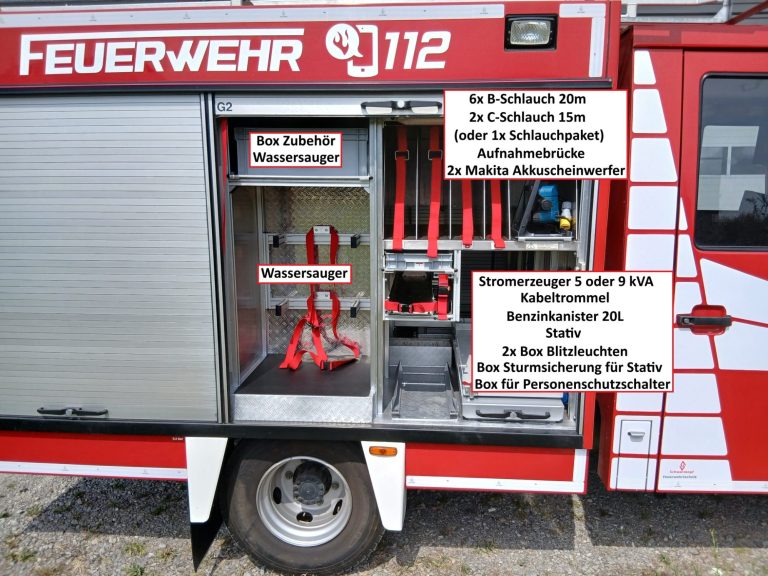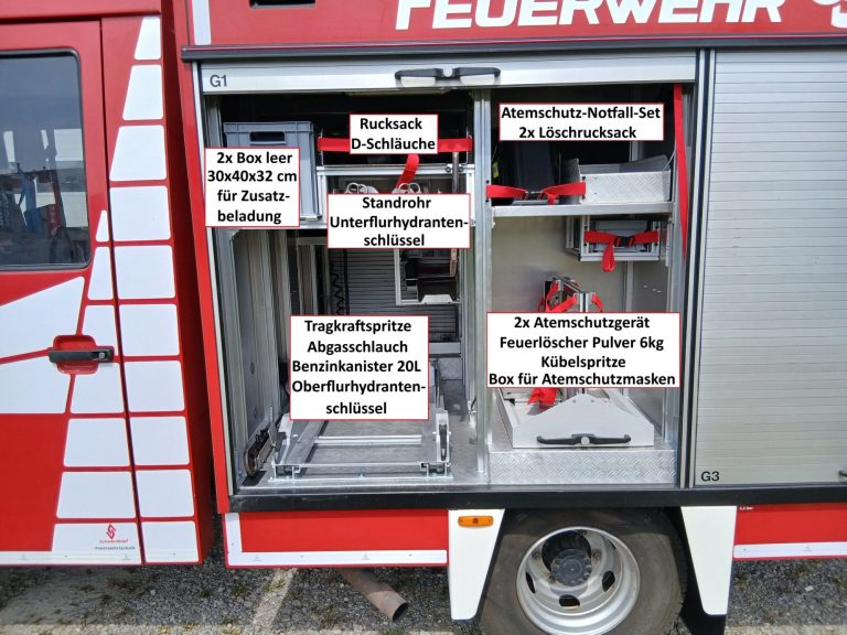 1x Tragkraftspritze, 1x Oberflurhydrantenschlüssel, 1x Unterflurhydrantenschlüssel, 1x Standrohr, 1x Abgasschlauch für TS, 1x Benzinkanister 20L, 1x Waldbrand-Rucksack für D-Schläuche, 1x Atemschutz-Notfall-Set, 2x Löschrucksack, 2x Atemschutzgerät, 1x Box für Atemschutzmasken, 1x Feuerlöscher Pulver 6kg, 1x Kübelspritze, 2x Box leer für Zusatzbeladung (Maße Box: 30x40x32 cm)
