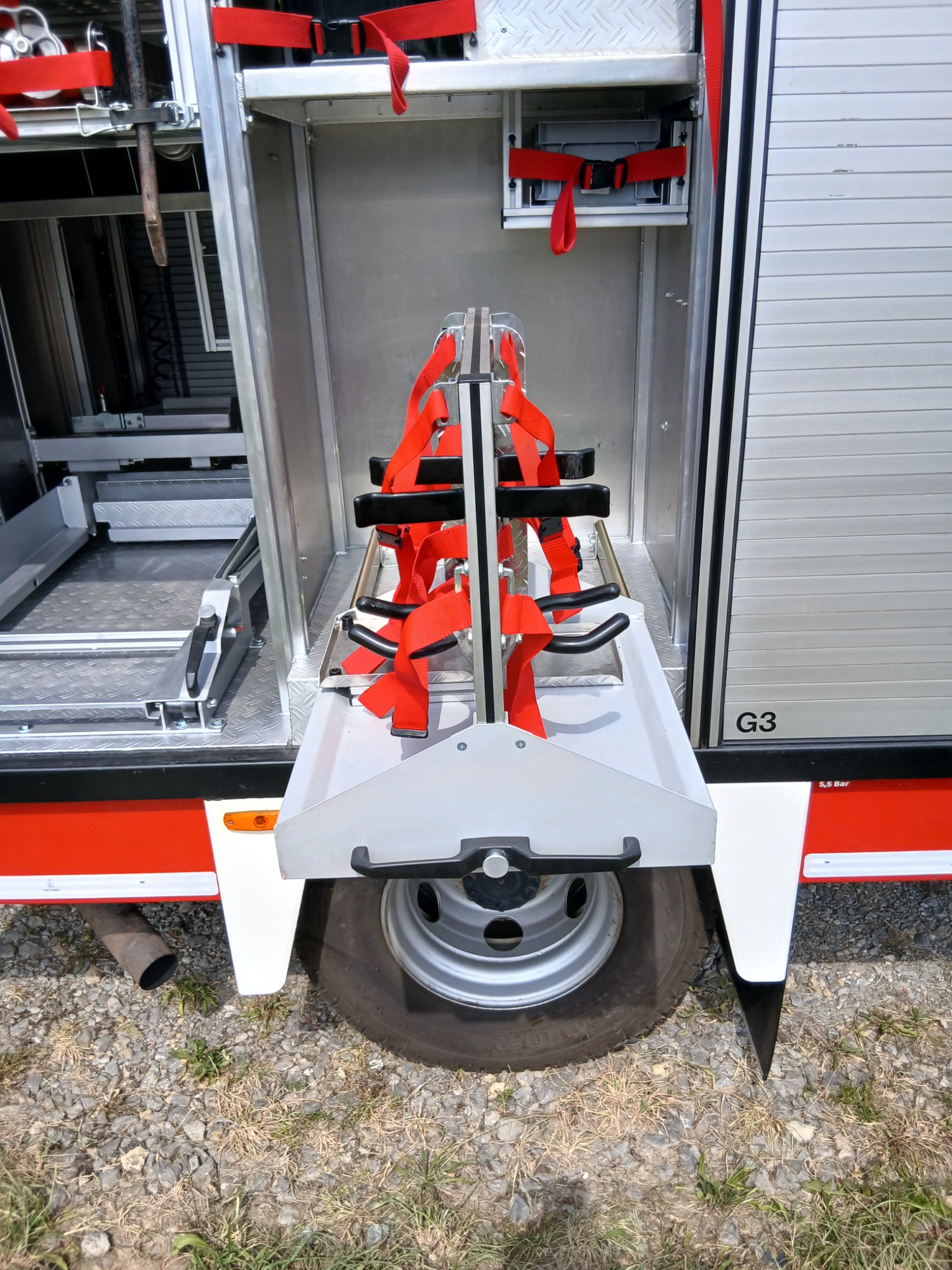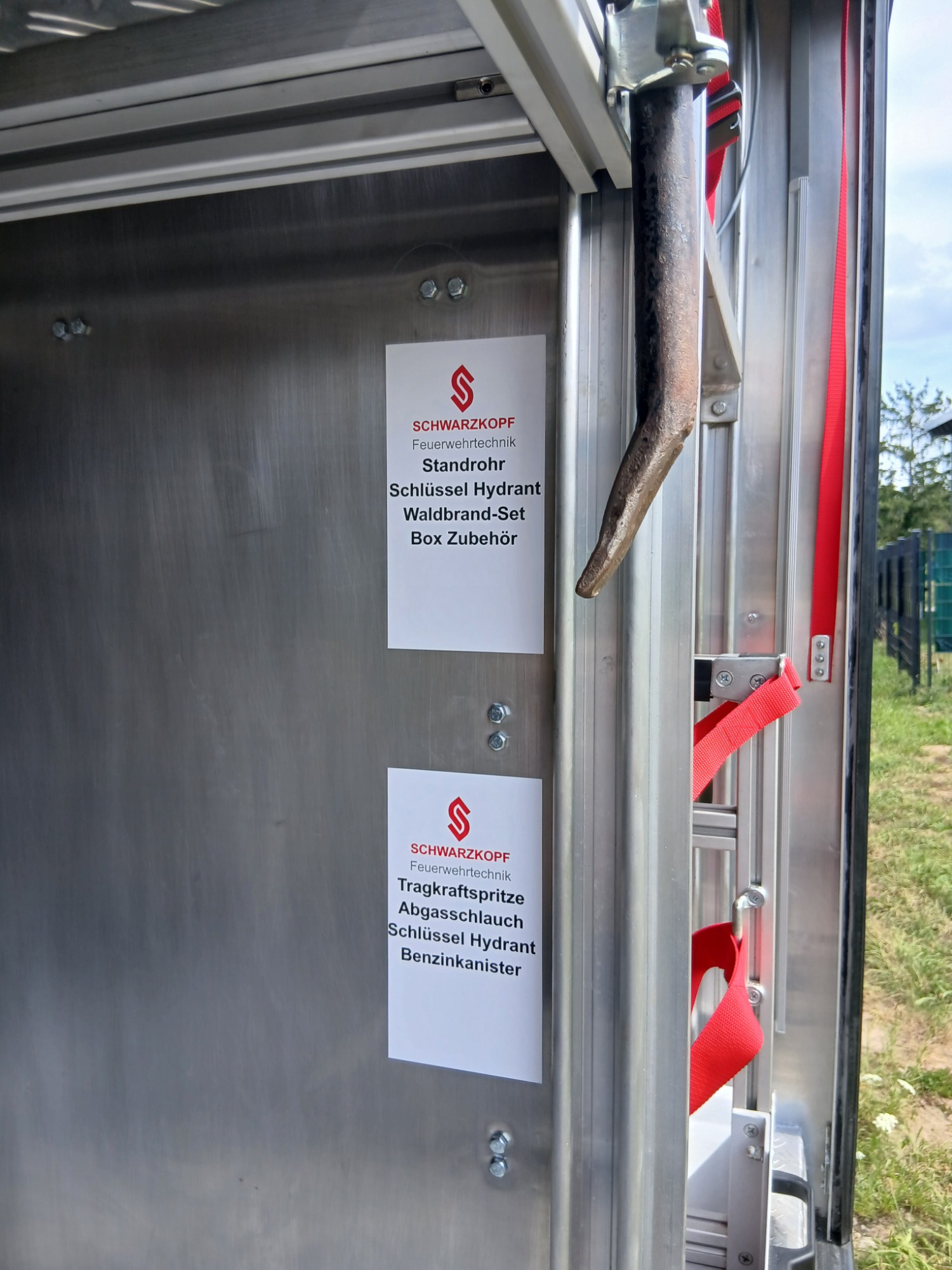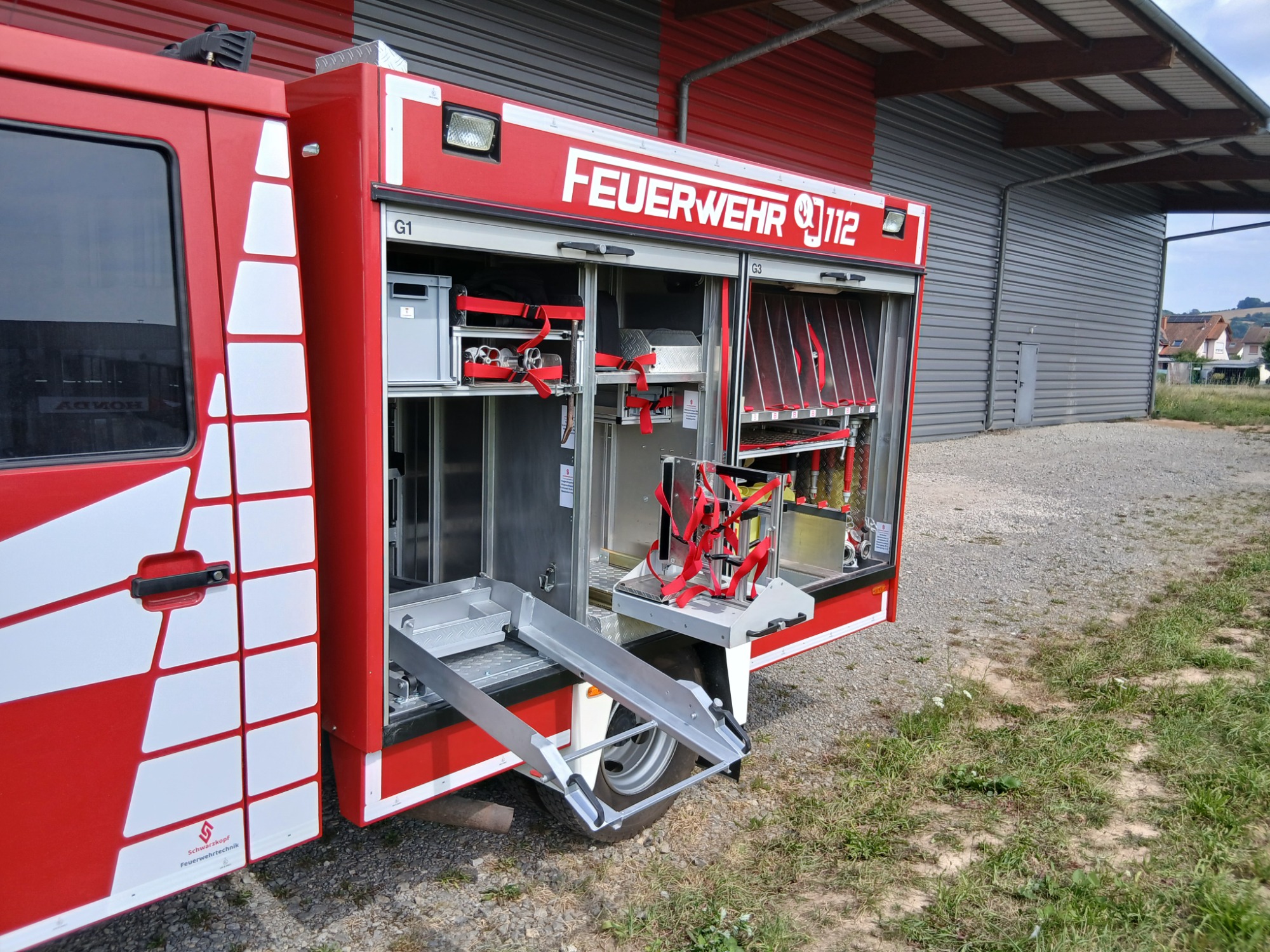 1x Tragkraftspritze, 1x Oberflurhydrantenschlüssel, 1x Unterflurhydrantenschlüssel, 1x Standrohr, 1x Abgasschlauch für TS, 1x Benzinkanister 20L, 1x Waldbrand-Rucksack für D-Schläuche, 1x Atemschutz-Notfall-Set, 2x Löschrucksack, 2x Atemschutzgerät, 1x Box für Atemschutzmasken, 1x Feuerlöscher Pulver 6kg, 1x Kübelspritze, 2x Box leer für Zusatzbeladung (Maße Box: 30x40x32 cm)