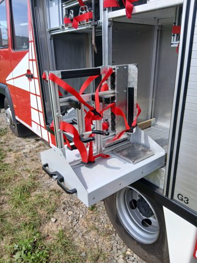 1x Krankenhausdecke, 2x Schnittschutzhose, 2x Forsthelm, 1x Tasche für Wechselkleidung, Platz für Zusatzbeladung
