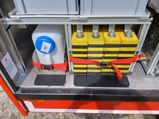 1x Ladegerät für Makita-Akku 18V, 1x Tasche (feuerfest) für Reserve-Akkus, 1x Wagenheber, 1x Hebel Wagenheber, 2x Warnlampe StVO, 2x Warndreieck StVO, 1x Kfz-Verbandskasten, Platz für Zusatzbeladung (z.B. Wasserflaschen)