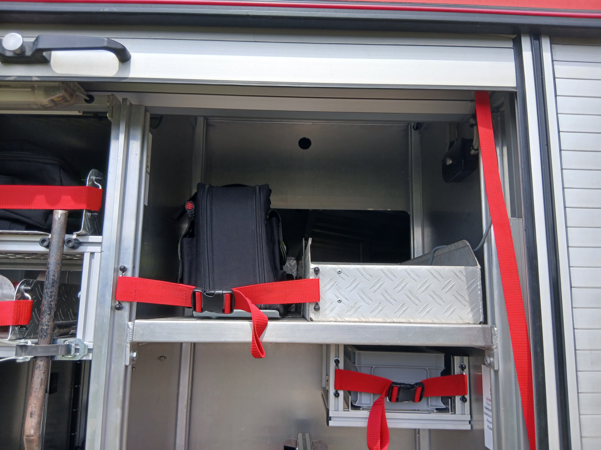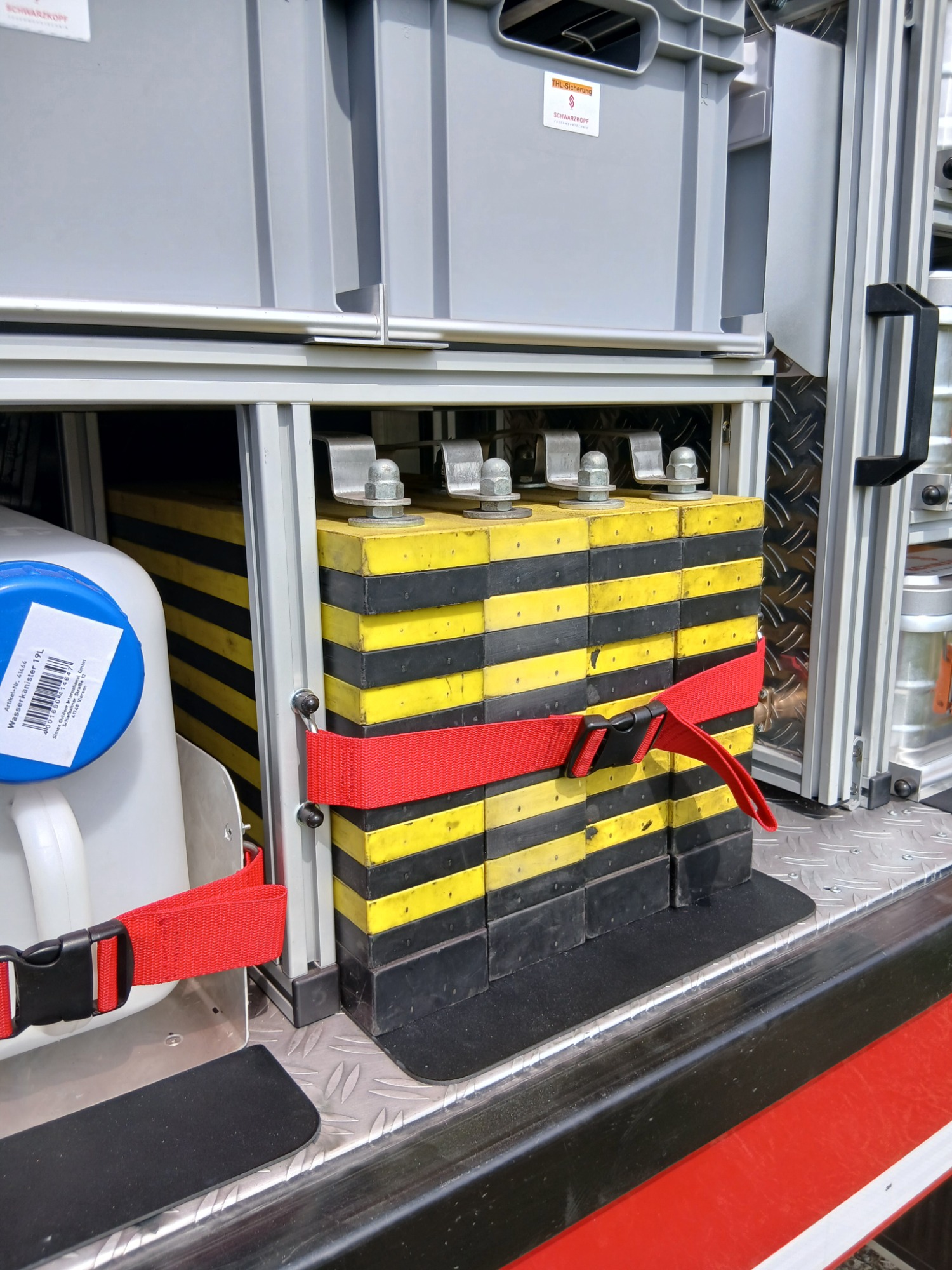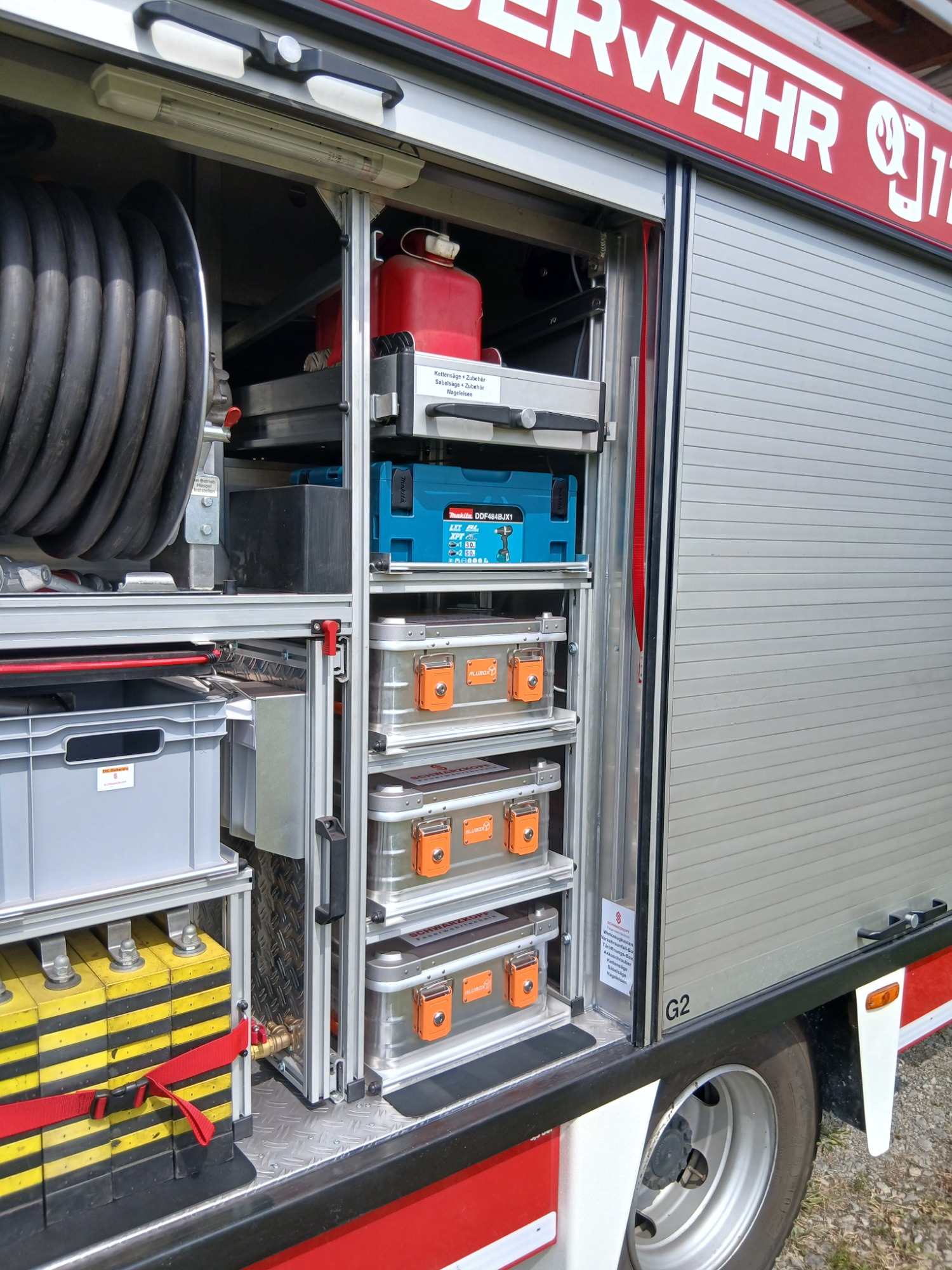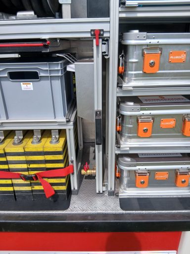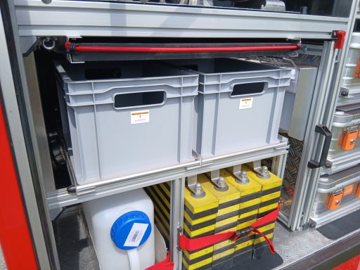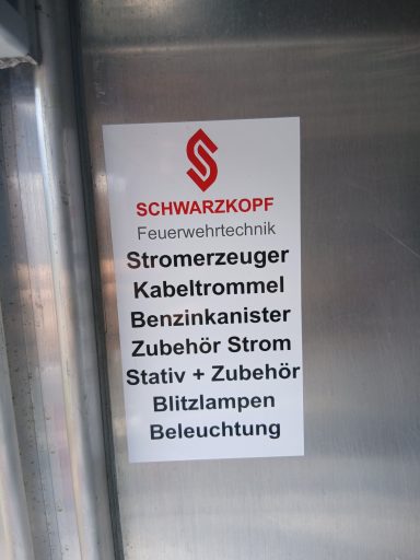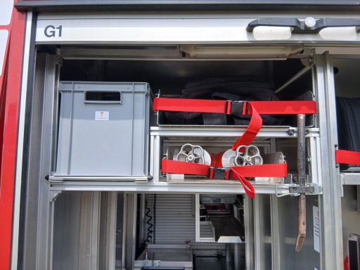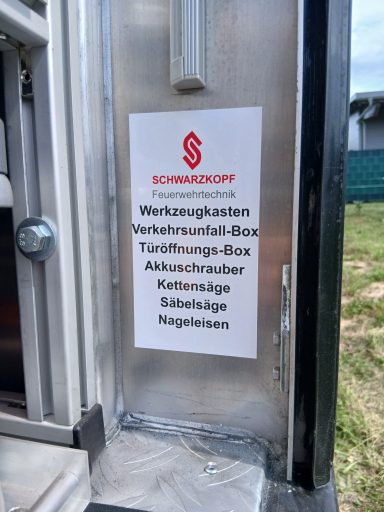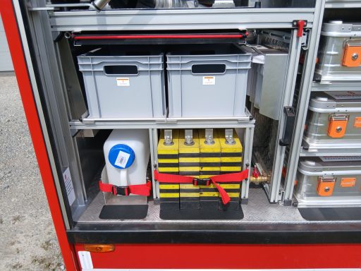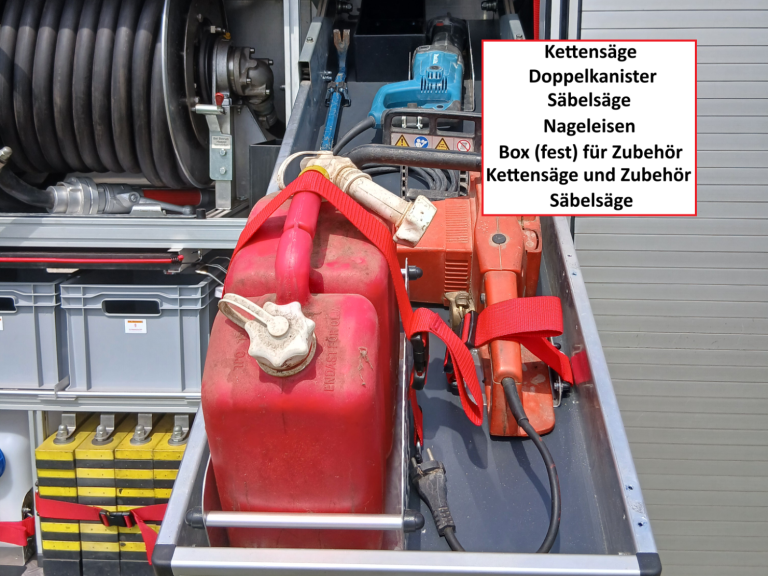 1x Box Atemschutzhygiene, 1x Box Zubehör THL, 1x Weithalskanister für Ölbindemittel, 4x Unterbaumaterial (Weber Schiebeblock), 4x Unterlegplatte für Weber Schiebeblock, 1x Hygieneboard (Spender Seife, Spender Desinfektionsmittel, Spender Papiertücher), 1x Alubox Handwerkzeug, 1x Alubox Verkehrsunfallkasten, 1x Alubox Türöffnungswerkzeug, 1x Box Akkuschrauber, 1x S-Schlauch 30m + C-Strahlrohr