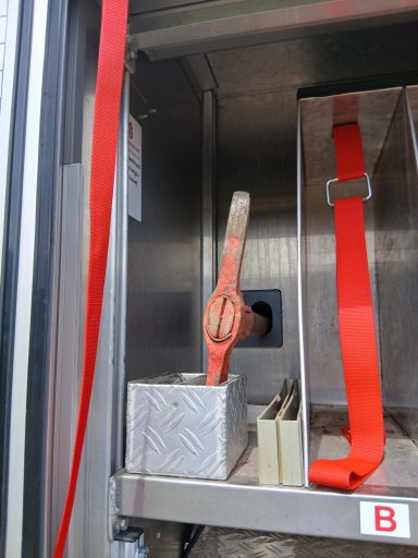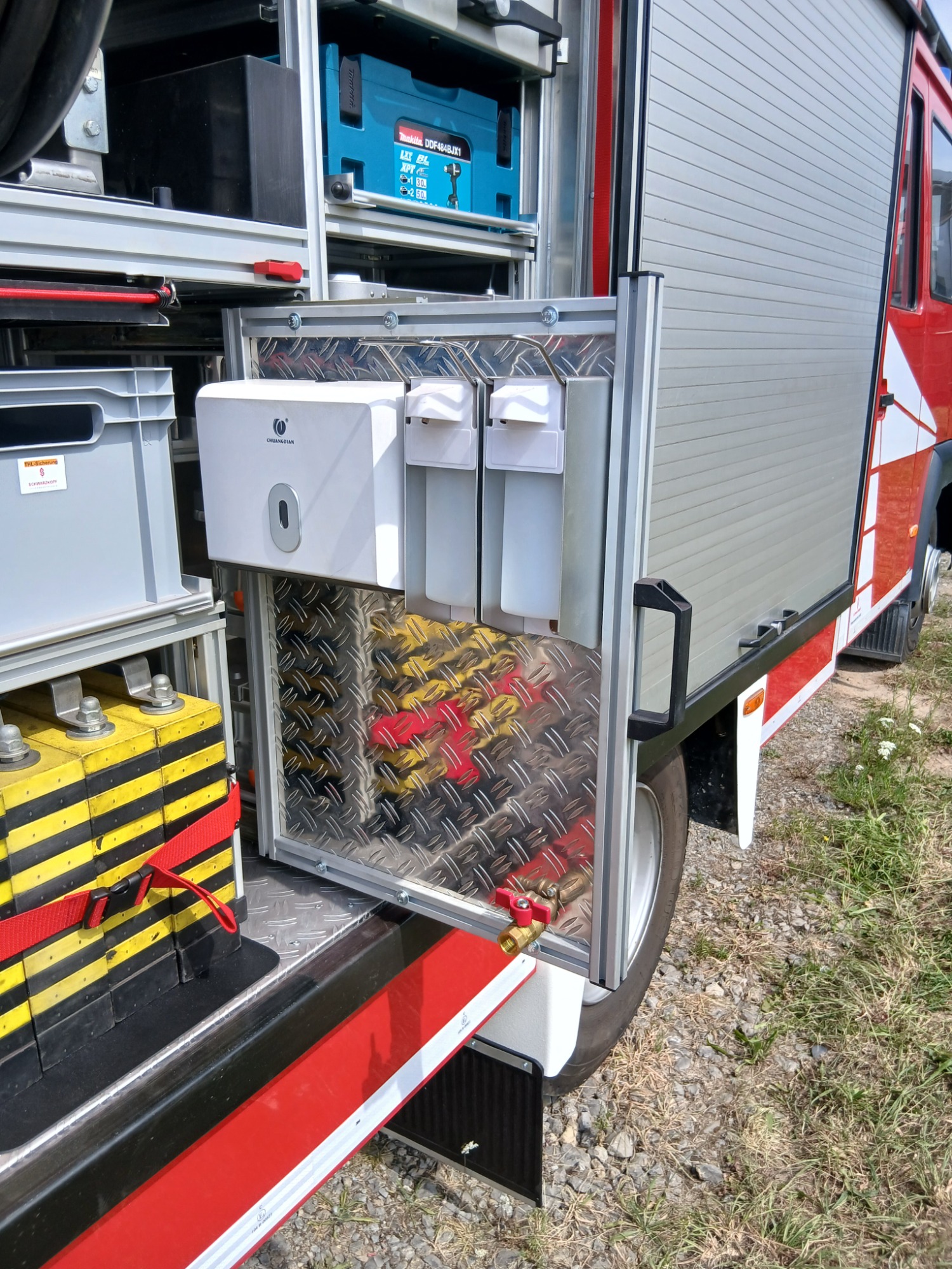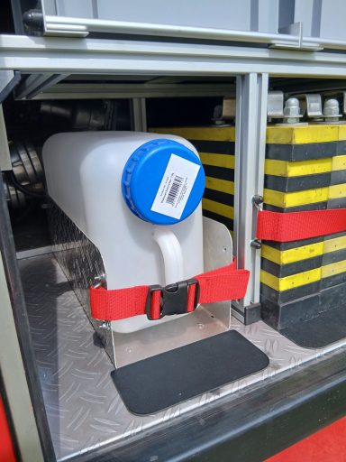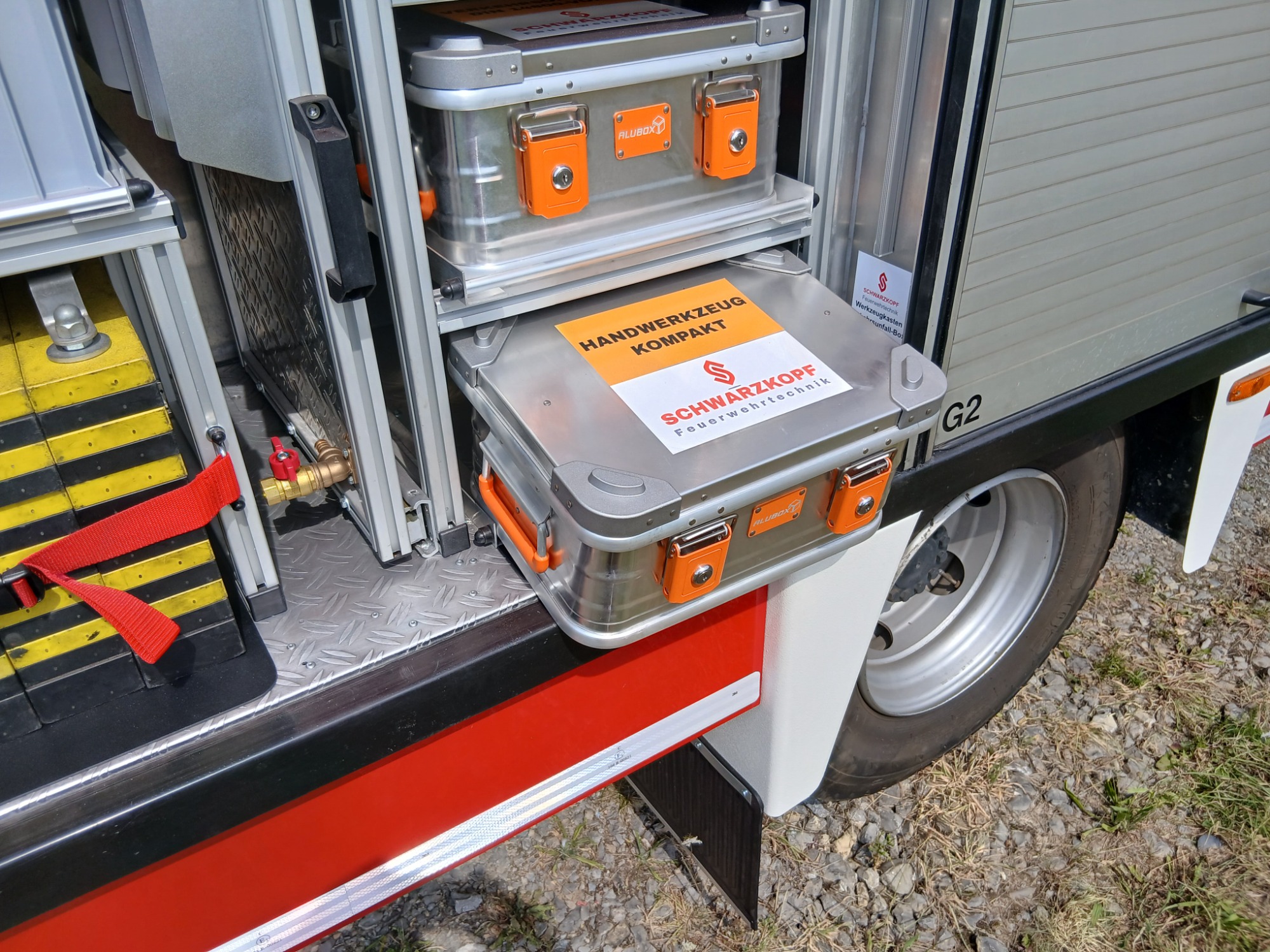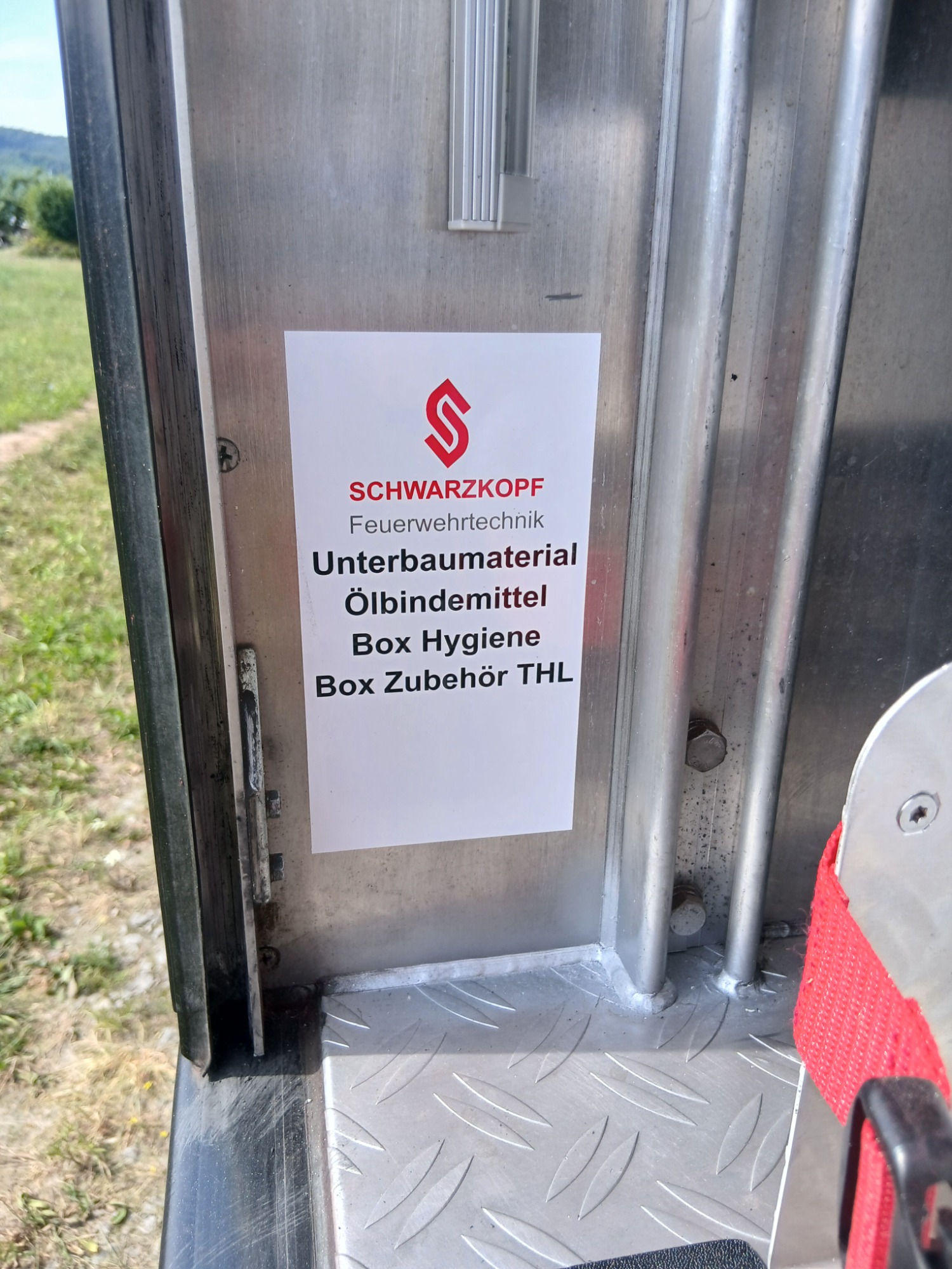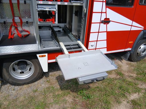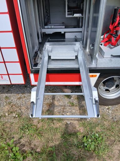 1x Box Atemschutzhygiene, 1x Box Zubehör THL, 1x Weithalskanister für Ölbindemittel, 4x Unterbaumaterial (Weber Schiebeblock), 4x Unterlegplatte für Weber Schiebeblock, 1x Hygieneboard (Spender Seife, Spender Desinfektionsmittel, Spender Papiertücher), 1x Alubox Handwerkzeug, 1x Alubox Verkehrsunfallkasten, 1x Alubox Türöffnungswerkzeug, 1x Box Akkuschrauber, 1x S-Schlauch 30m + C-Strahlrohr