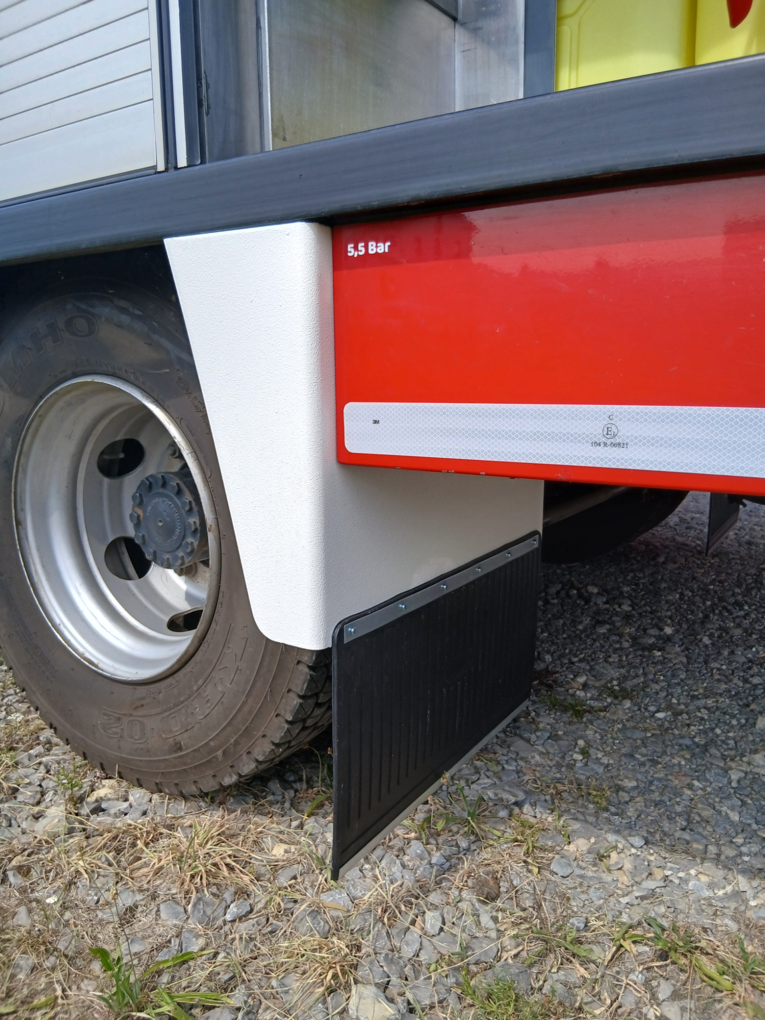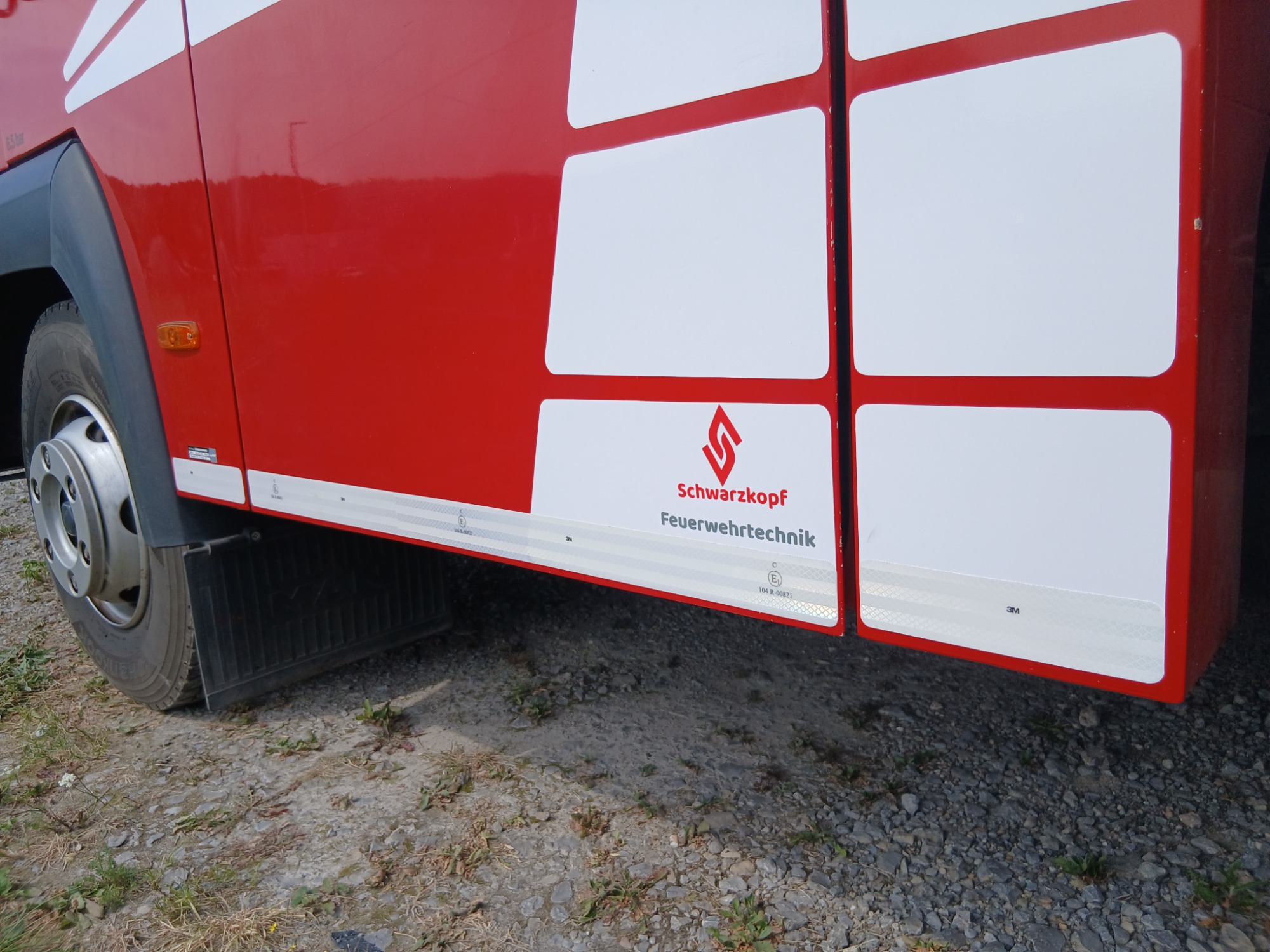 Das Fahrzeug wurde neu foliert. Das Heck hat eine Heckwarnmarkierung (Farbe: rot/gelb) sowie eine Konturmarkierung in Rot erhalten. Die Seiten und die Front wurden mit weißer Folie, nach Vorbild der Firma Schlingmann, neu beklebt. Die seitliche Konturbeklebung wurde in der Farbe Weiß ausgeführt.
