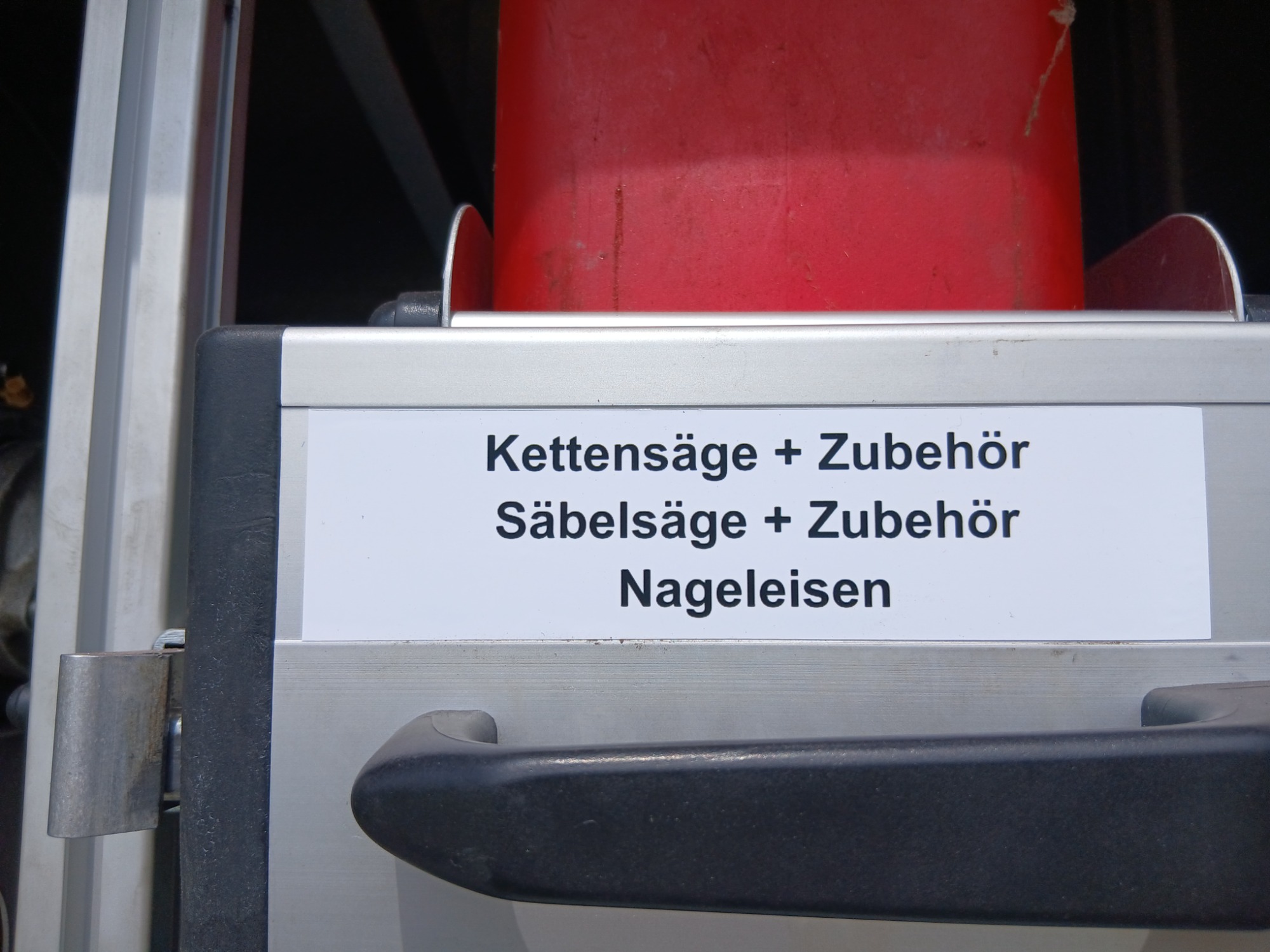 1x Kettensäge, 1x Doppelkanister (Aspen + Kettenöl), 1x Säbelsäge, 1x Nageleisen, 1x Box (fest verbaut) für Zubehör Kettensäge und Zubehör Säbelsäge (z.B. Ersatzsägeblätter, Werkzeugtasche Kettensäge,...)